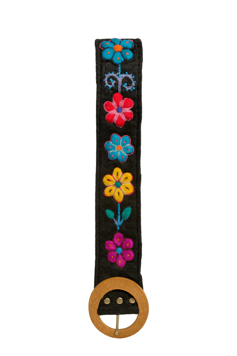 Cinturón de fieltro delgado, bordado de flores ayacuchana con evilla de diversos materiales